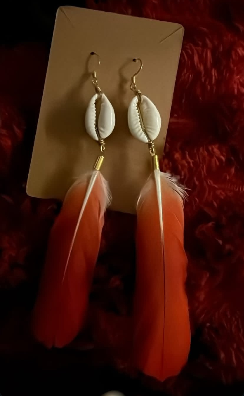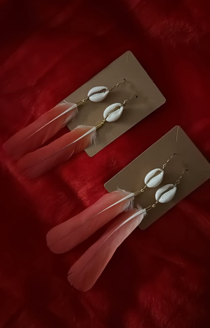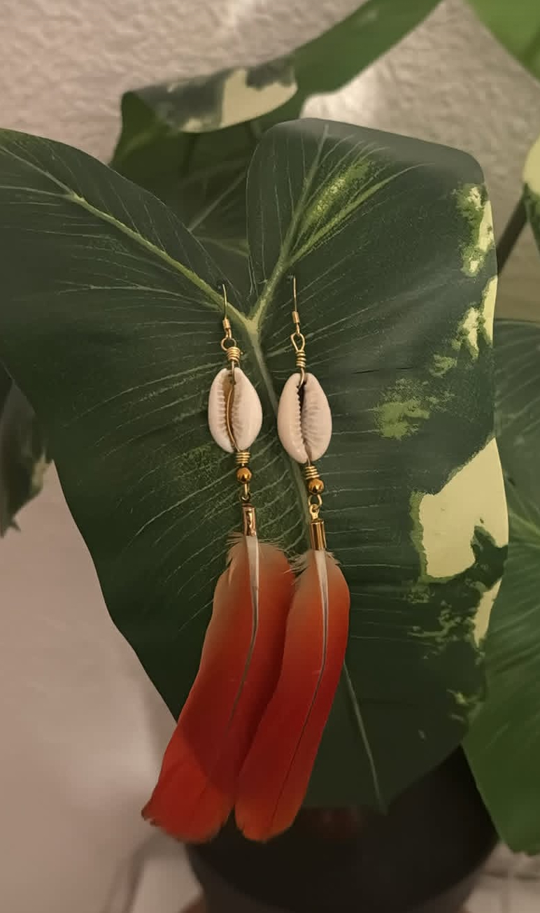 Chaque paire est une œuvre d'art. Inspirées par la nature gabonaise, ces boucles allient tradition, élégance et authenticité. Fabriquées à la main avec des matériaux naturels soigneusement sélectionnés — coquillage cauri, laiton doré et plumes véritables de perroquet.